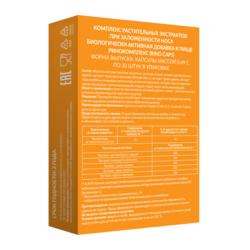 Дискомфорт слизистой оболочки полости носа, околоносовых пазух, появление отделяемого из носа являются частым спутником простуды. Биологически активные вещества экстрактов растений РИНОКОМПЛЕКС (RINO CAPS) способствуют снижению отека слизистой, более легкому отхождению выделений из носа и восстановлению носового дыхания.