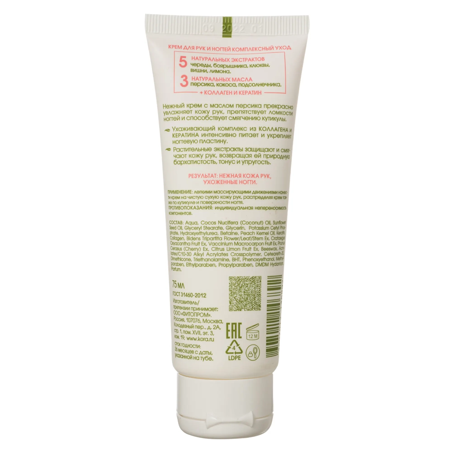 Нежный крем с маслом персика прекрасно увлажняет кожу рук, препятствует ломкости ногтей и способствует смягчению кутикулы. Ухаживающий комплекс из коллагена и кератина интенсивно питает и укрепляет ногтевую пластину, устраняет сухость кожи, возвращая ей природную бархатистость, тонус и упругость. Растительные экстракты защищают и смягчают кожу рук, возвращая ей природную бархатистость, тонус и упругость.