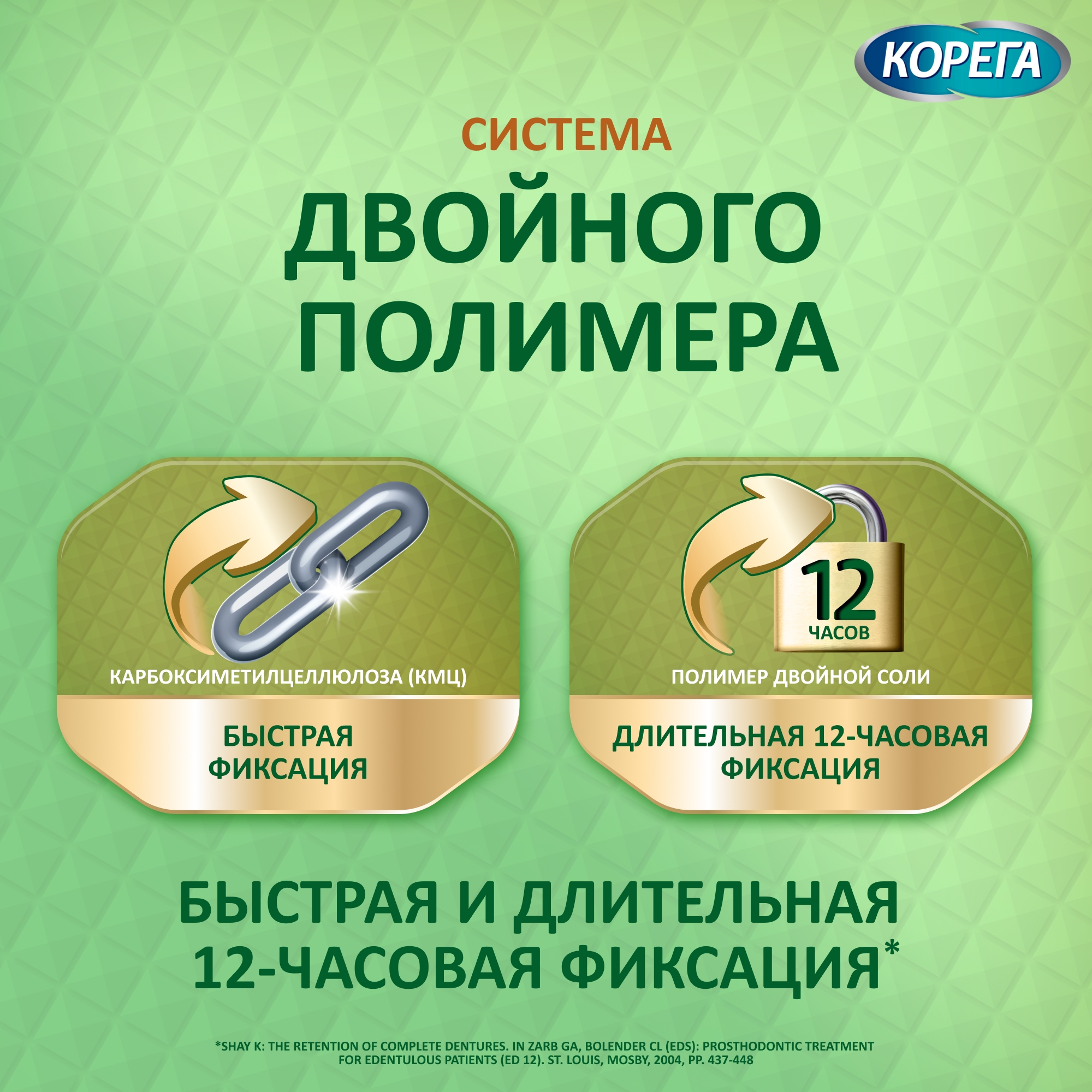 Корега Крем для фиксации зубных протезов максимальная фиксация+свежесть - клинически доказано, что крем для фиксации зубных протезов Корега обеспечивает фиксацию зубного протеза до 12 часов и длительную свежесть в полости рта.