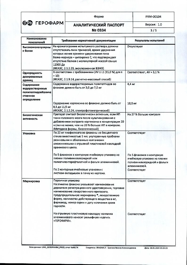 Активное вещество: комплекс водорастворимых полипептидных фракций коры головного мозга скота (кортексин)* 10 мг.