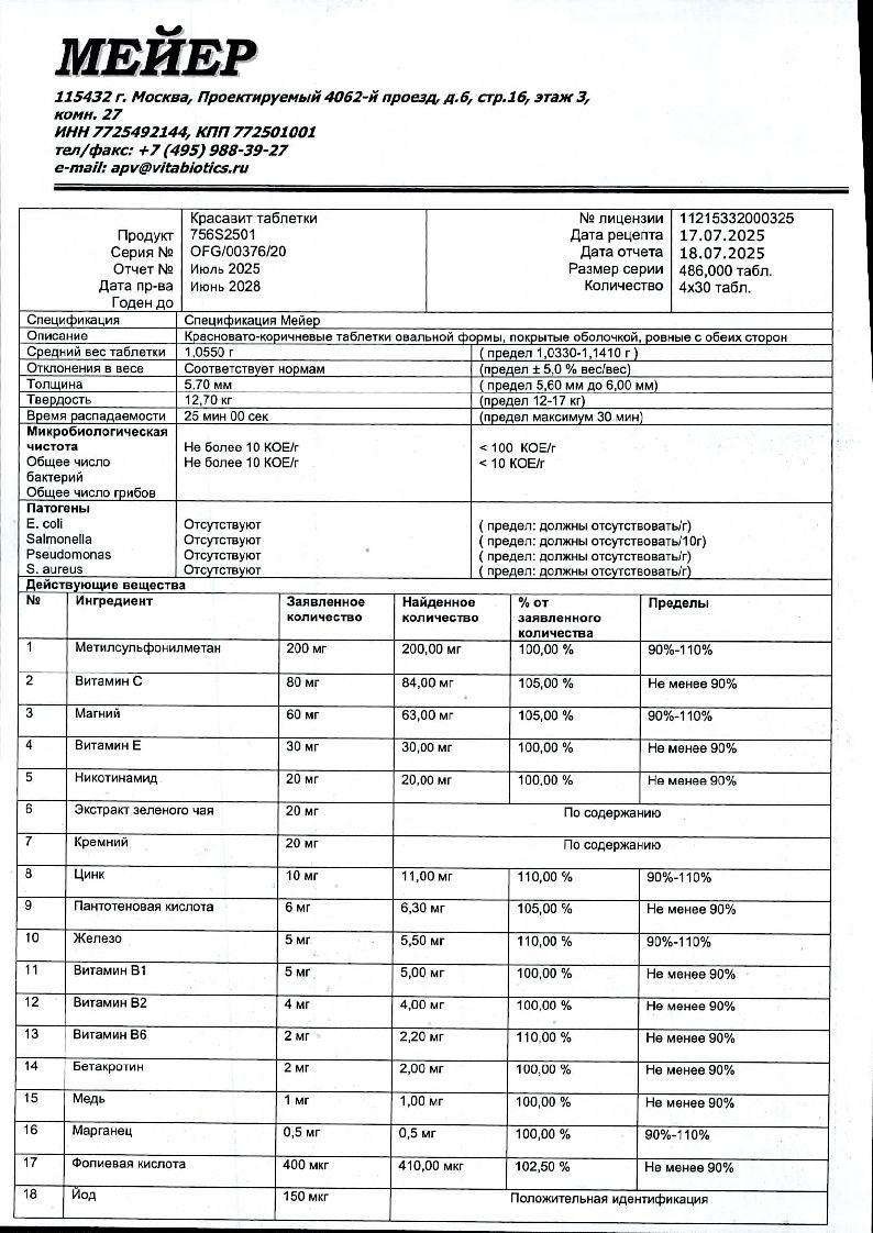 Метилсульфонилметан, стабилизатор фосфат кальция Е341, носитель микрокристаллическая целлюлоза Е460, оксид магния, альфа-токоферола ацетат (витамин Е), аскорбиновая кислота (витамин С), картофельный крахмал, стабилизатор проливинилпирролидон Е1201, диоксид кремния, таблеточное покрытие (стабилизатор гидроксипропилцеллюлоза Е463, красители: красный, черный, желтый оксиды железа Е172, диоксид титана Е171, стабилизатор гидроксипропилметилцеллюлоза), сульфат цинка, покрытие оболочки (стабилизатор гидроксипропилметилцеллюлоза Е464, носители: пропиленгликоль Е1520, этилцеллюлоза Е462), никотинамид, экстракт зеленого чая, железа фумарат, бета-каротин, антислеживающий агент магния стеарат Е572, агент антислеживающий тальк Е553, цианокобаламин (витамин В12), пантотенат кальция, тиамина мононитрат, рибофлавин, витамин D3, сульфат меди, пиридоксина гидрохлорид, сульфат марганца, фолиевая кислота, хлорид хрома, йодид калия, селенат натрия, биотин, вода очищенная.