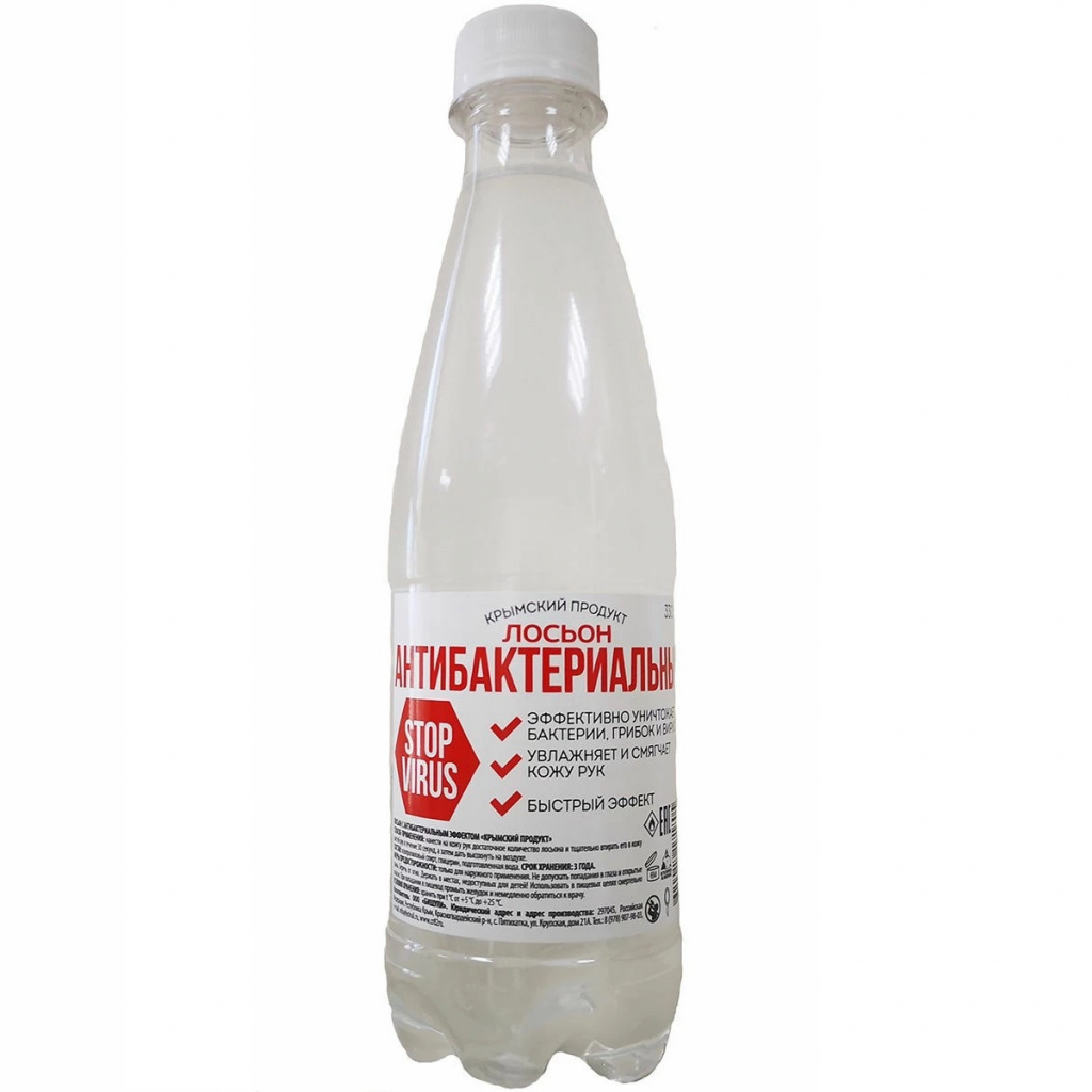 Лосьон с антибактериальным эффектом "Крымский продукт" прозрачная, бесцветная жидкость. Предназначен для дезинфекционной обработки кожи рук и окружающих поверхностей. Способствует уничтожению 99.9 % микробов, бактерий и вирусов. Изготовлен на основе изопропилового спирта с добавлением глицерина, для увлажнения и умягчения кожи, специально подготовленная очищенная вода. Средство легкое, не оставляющее на руках, одежде и поверхностях жирных пятен. Без отдушек. Сразу после покупки готово к использованию. Для обработки рук нанесите несколько капель на ладонь, и тщательно разотрите руки до полного высыхания. Горлышко бутылки стандартное. На него можно накрутить крышку пульверизатор и продезинфицировать одежду и поверхности.