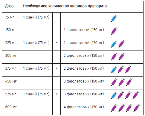 Примечание. В зависимости от дозы, назначенной Вашим врачом, Вам может понадобиться приготовить для последующего использования один или несколько предварительно заполненных шприцев. В данной таблице приведены примеры того, сколько инъекций препарата определенной дозировки необходимо ввести, чтобы получить необходимую дозу препарата: