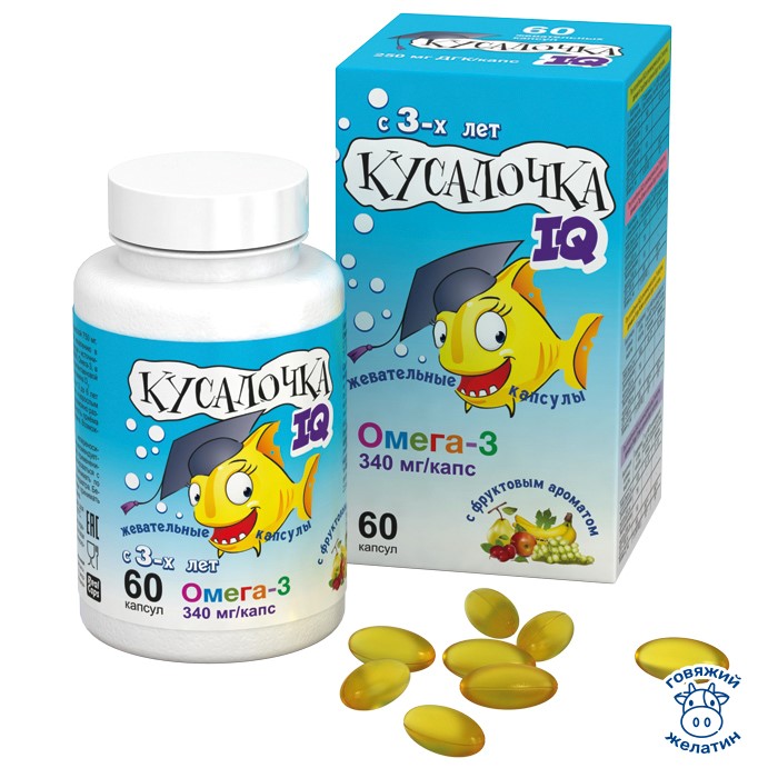 КУСАЛОЧКА рыбий жир создан для маленьких исследователей, которым интересно всё вокруг. Чтобы узнать, что там внутри, капсулу КУСАЛОЧКИ можно раскусить. Ребёнок не получит негативных ощущений от контакта с содержимым. Для производства КУСАЛОЧКИ используется жир высокой степени очистки. В нём отсутствуют рыбные энзимы, обуславливающие характерный запах и вкус. Однако, если вдруг ребёнку не понравилось содержимое капсулы, в следующий раз её можно глотать, не раскусывая – капсула растворится в желудке. Ребёнку от 3-х до 7-ми лет на курс приёма понадобится упаковка, содержащая 60 капсул, детям от 7-ми лет и взрослым подойдёт упаковка, содержащая 90 капсул.
