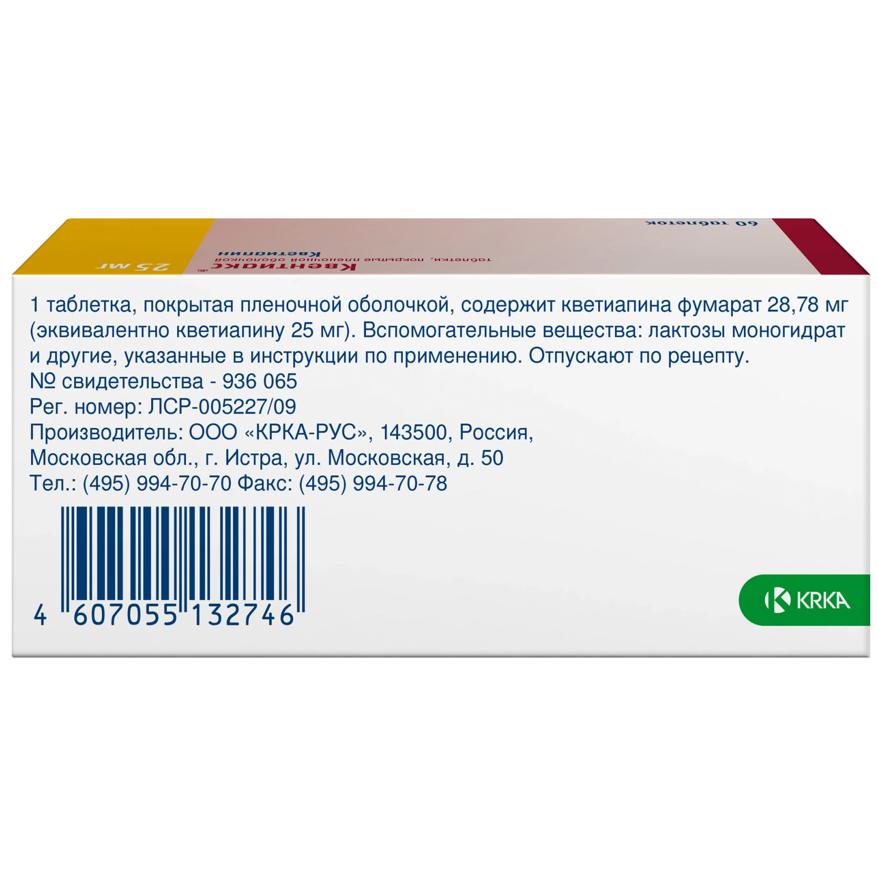T1/2 составляет около 7 ч. Менее 5% кветиапина выводится в неизмененном виде почками или через кишечник. Приблизительно 73% метаболитов выводится почками и 21% - через кишечник. Средний клиренс кветиапина у пожилых пациентов на 30-50% меньше, чем наблюдаемый у пациентов в возрасте от 18 до 65 лет.
