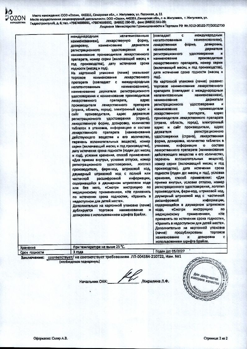 Вспомогательные вещества: целлюлоза микрокристаллическая - 54.2 мг, лактозы моногидрат - 21.44 мг, кальция гидрофосфата дигидрат - 38 мг, повидон К-25 - 17.1 мг, карбоксиметилкрахмал натрия - 15.2 мг, магния стеарат - 3.8 мг. Состав пленочной оболочки: гипромеллоза - 5.5 мг, титана диоксид - 3 мг, макрогол 4000 - 1.5 мг.