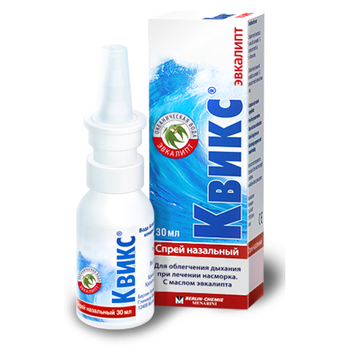 КВИКС® Эвкалипт – это природный гипертонический спрей, содержащий очищенную воду из Атлантического океана с добавлением небольшого количества очищенного эвкалиптового масла. Концентрация соли в медицинском изделии КВИКС® Эвкалипт выше, чем в слизистой оболочке носа (гипертонический солевой раствор), благодаря чему возникает осмотическое давление, благоприятно воздействующее на снятие отёка.