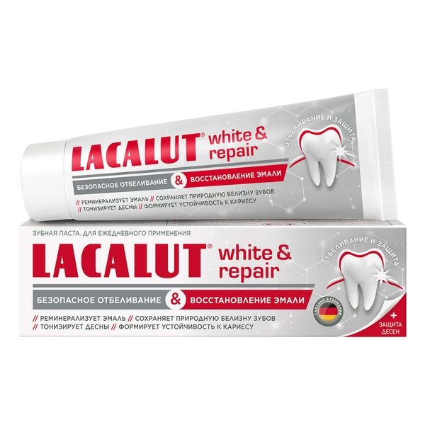 Ежедневная профилактическая зубная паста для бережного отбеливания и репарации эмали зубов. Рекомендуется к применению при отбеливании зубов в домашних условиях (в том числе и при гиперчувствительности дентина). Регулярное применение зубной пасты Lacalut white & repair также предотвращает потемнение эмали.