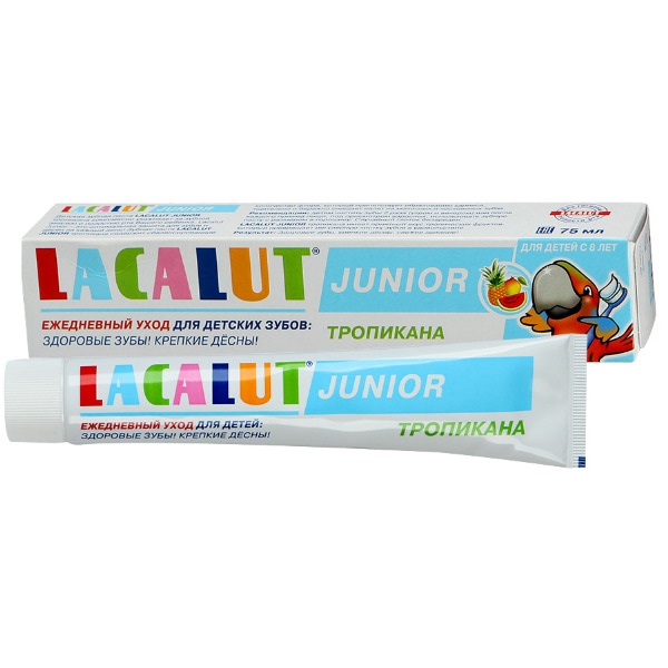 В состав LACALUT Junior Tropicana входит дорогостоящий абразивный компонент, который тщательно и бережно очищает от налета постоянные и молочные зубы. Гелевая паста не содержит сахара и обладает оригинальным вкусом, мотивирующим детей к чистке зубов.