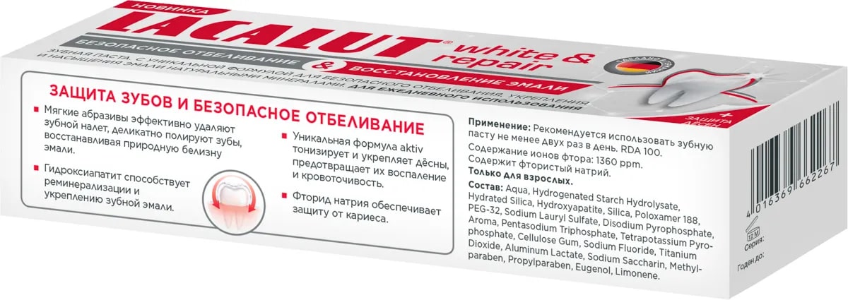 Уникальная комбинация активных веществ зубной пасты Lacalut® white & repair укрепляет, восстанавливает, бережно отбеливает зубную эмаль и обеспечивает защиту зубов и дёсен: