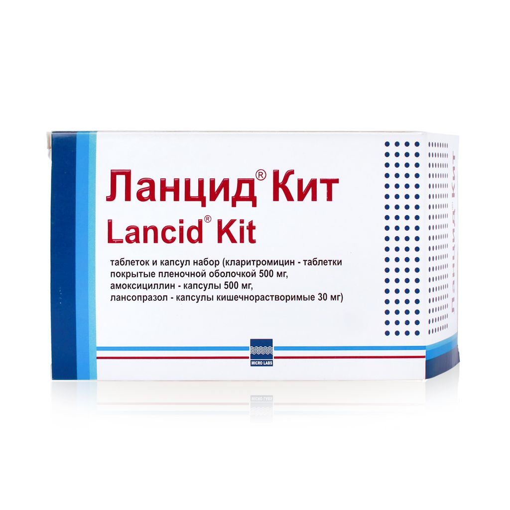 Каждый блистер препарата Ланцид® Кит содержит две таблетки кларитромицина (500 мг), четыре капсулы амоксициллина (500 мг) и 2 капсулы лансопразола (30 мг) и рассчитан на один день лечения. Одна упаковка содержит 7 блистеров и рассчитана на один курс лечения.