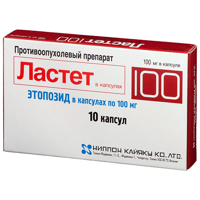 капсула: желатин 290.0 мг, сорбитола раствор 29,0 мг. глицерин концентрированный 116,0 мг, этилпарагидроксибензоат 1.16 мг, пропилпарагидроксибензоат 0,58 мг, титана диоксид 0,58 мг, краситель железа оксид красный 0,58 мг, хлористоводородная кислота q.s., вода очищенная q.s.После приема внутрь этопозид всасывается из желудочно-кишечного тракта. Средняя биодоступность составляет 50% и не изменяется при приеме пищи. Препарат обнаруживается в плевральной жидкости, печени, селезенке, почках, миометрии. Этопозид проникает через плацентарный барьер. Значения концентрации этопозида в спинномозговой жидкости варьируют от неопределяемых значений до 5% от концентрации в плазме крови. Имеются данные о выделении препарата с грудным молоком. Связывание с белками плазмы составляет примерно 90%.