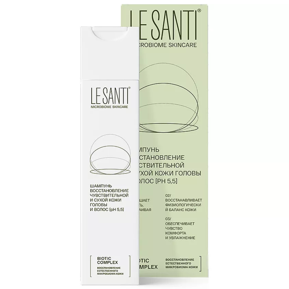 ШАМПУНЬ Ле Санти (LE SANTI) ВОССТАНОВЛЕНИЕ ЧУВСТВИТЕЛЬНОЙ И СУХОЙ КОЖИ ГОЛОВЫ И ВОЛОС разработан специально для деликатного очищения сухой, очень сухой и чувствительной кожи головы и волос. Он уменьшает сухость и шелушение, успокаивает кожу, снимает ощущение зуда, восстанавливает физиологический баланс кожи, обеспечивая чувство коже комфорта и увлажнения.