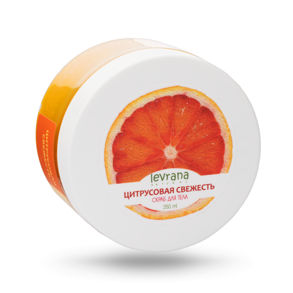 В основе скраба «Цитрусовая свежесть» — морская соль. Увлажняющее действие оказывает масло облепихи и виноградной косточки. Скраб обладает освежающим ароматом цитруса.