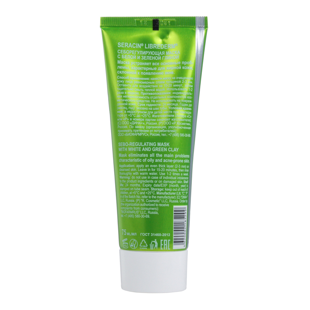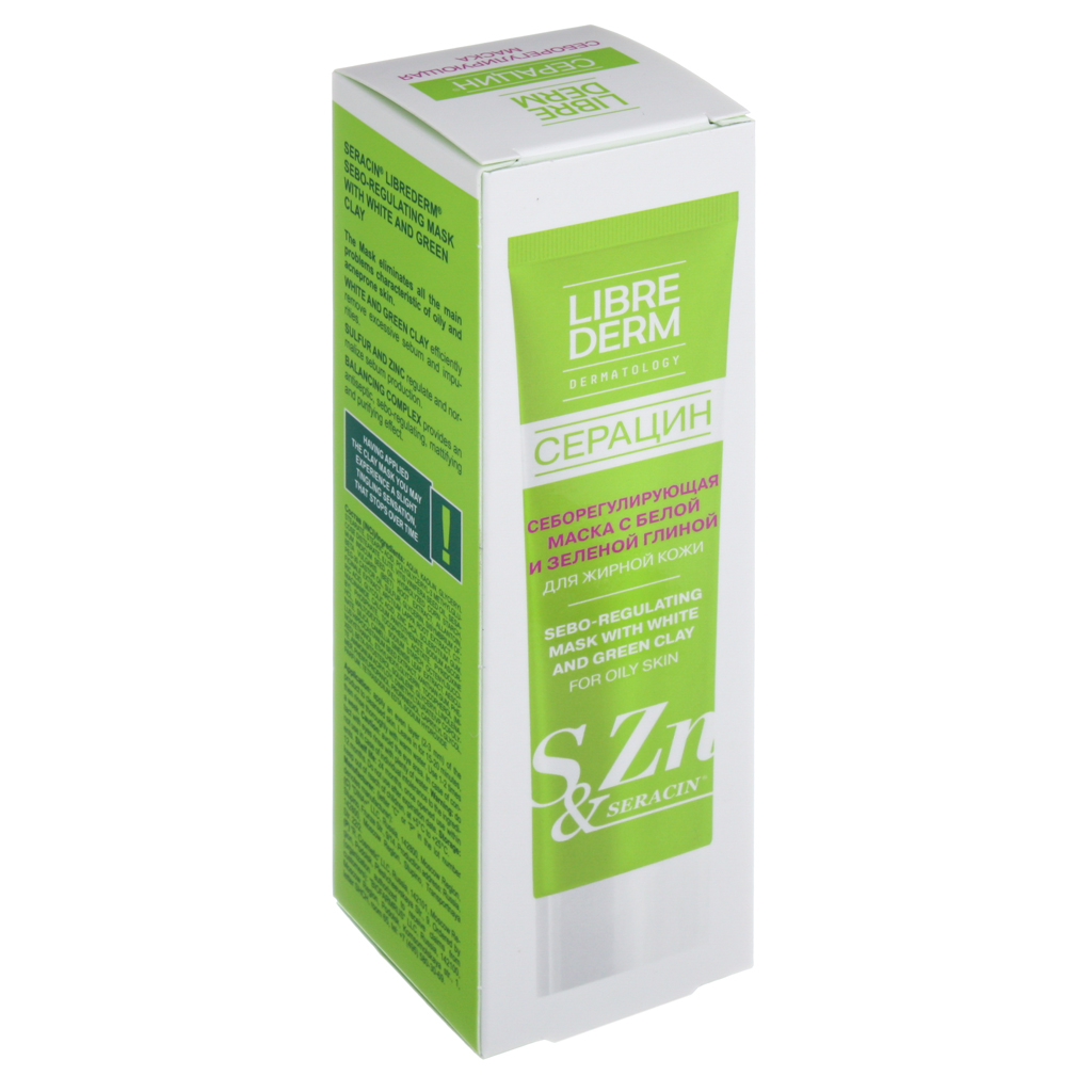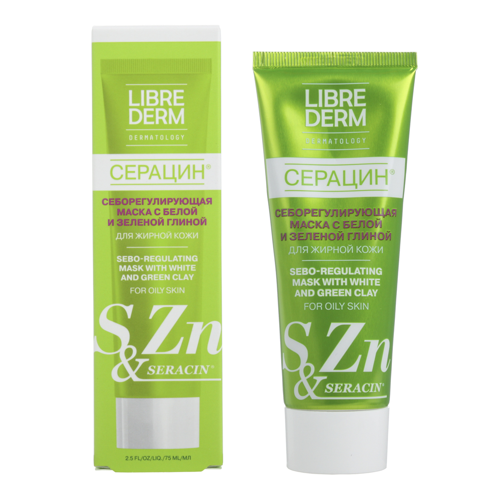 Либридерм Серацин Маска себорегулирующая с белой и зеленой глиной не пересушивает кожу, восстанавливает ее здоровое сияние, удаляет черные точки, борется с гнойничками и угревой сыпью, устраняет красноту и надолго матирует лицо.