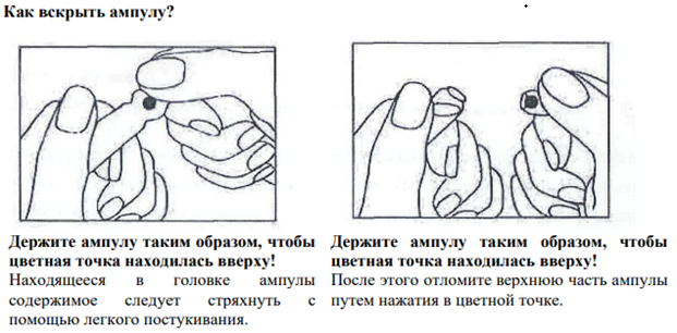 Находящееся в головке ампулы содержимое следует стряхнуть с помощью легкого постукивания.