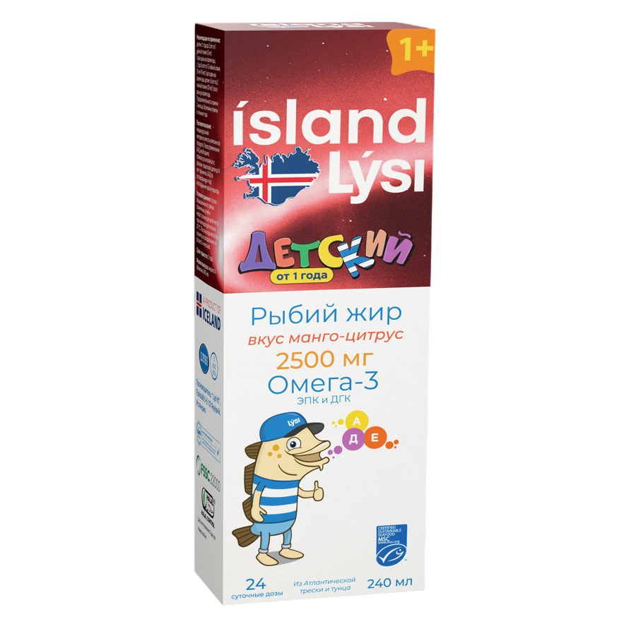 Рыбий жир, антиокислитель (смесь токоферолов Е306), витамин Е (d, I-альфа токоферола ацетат), витамин А (ретинола пальмитат), витамин ДЗ (холекальциферол), ароматизаторы натуральные: лимон, лимонмята, манго, мята.