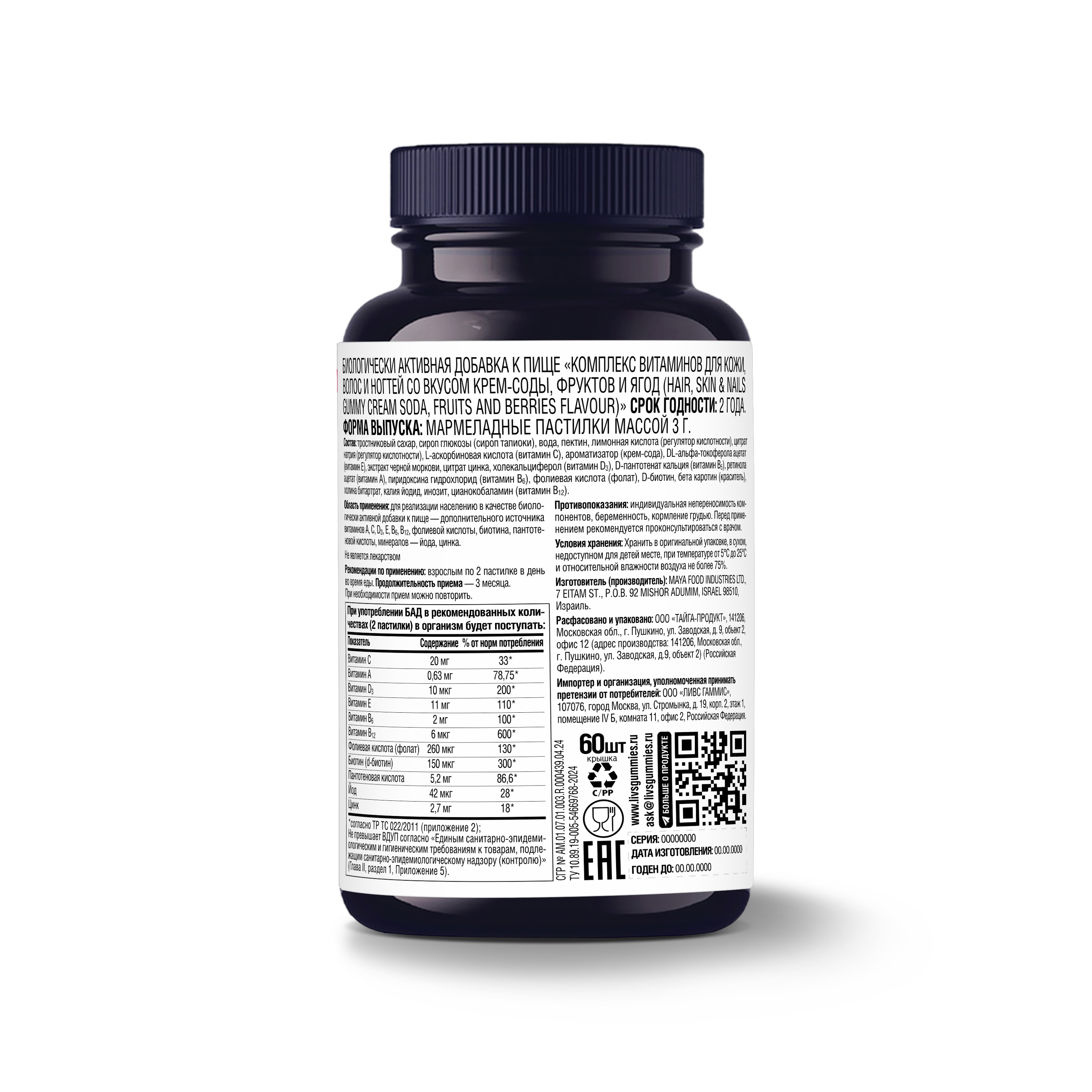 LIVS КОМПЛЕКС ВИТАМИНОВ ДЛЯ КОЖИ ВОЛОС И НОГТЕЙ СО ВКУСОМ КРЕМ-СОДЫ ФРУКТОВ И ЯГОД (LIVS HAIR SKIN NAILS) - Биологически активная добавка (БАД) к пище