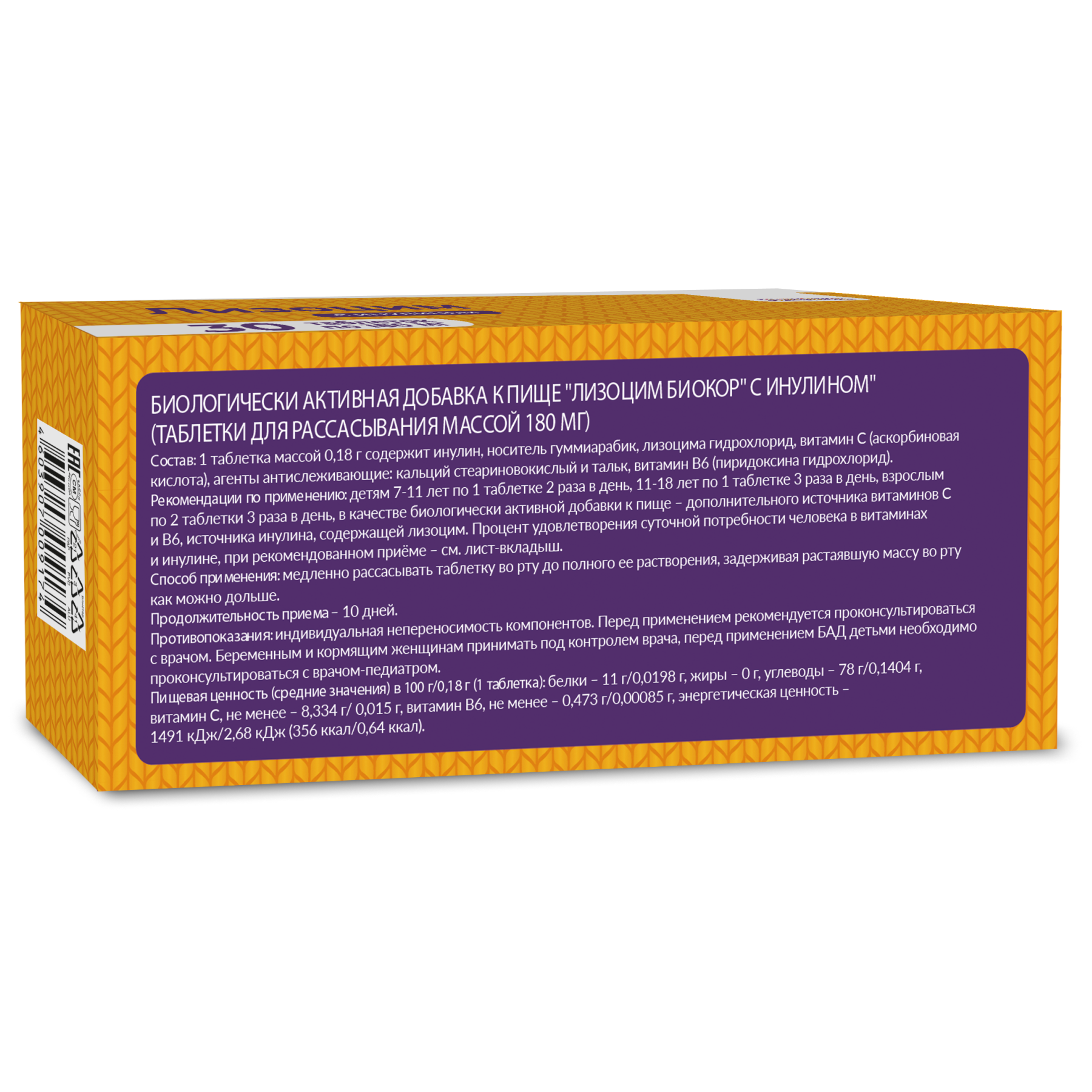 Пищевая ценность (средние значения) в 100 г/0,18 г (1 таблетка): белки – 11 г/0,0198 г, жиры – 0 г, углеводы – 78 г/0,1404 г, витамин С, не менее – 8,334 г/ 0,015 г, витамин В6, не менее – 0,473 г/0,00085 г, энергетическая ценность – 1491 кДж/2,68 кДж (356 ккал/0,64 ккал).