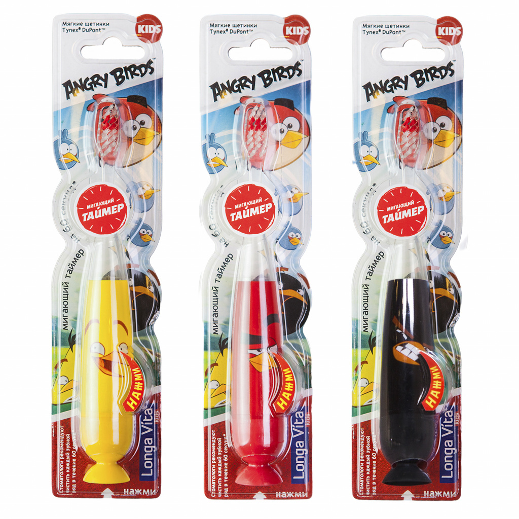 Птички Angry Birds на упаковках и ручках щетки. Наличие таймера позволяет легко определить время для чистки каждого зубного ряда, световой таймер работает 60 секунд. Это время, рекомендованное стоматологами для чистки каждого зубного ряда, а также увеличивает время чистки, тем самым улучшая гигиену полости рта. Щетина премиум класса Tynex DuPont обеспечивает безопасный уход. Специальное цветовое поле щетины для нанесения зубной пасты. Двойная полировка кончиков щетины. Присоска для гигиеничного хранения. Объемная ручка щетки идеально подходит для маленьких детей.