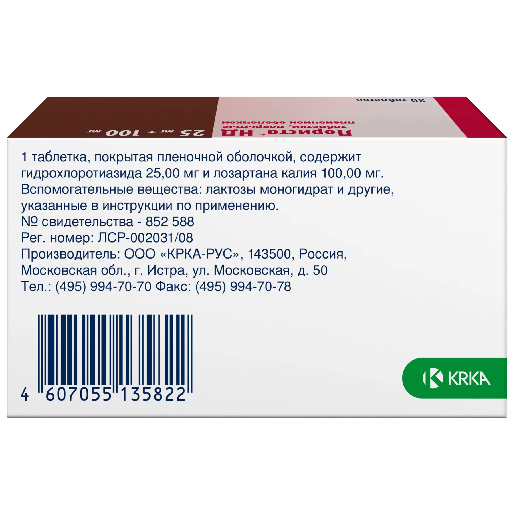 Действующие вещества: лозартан калия 100 мг, гидрохлоротиазид 25 мг.