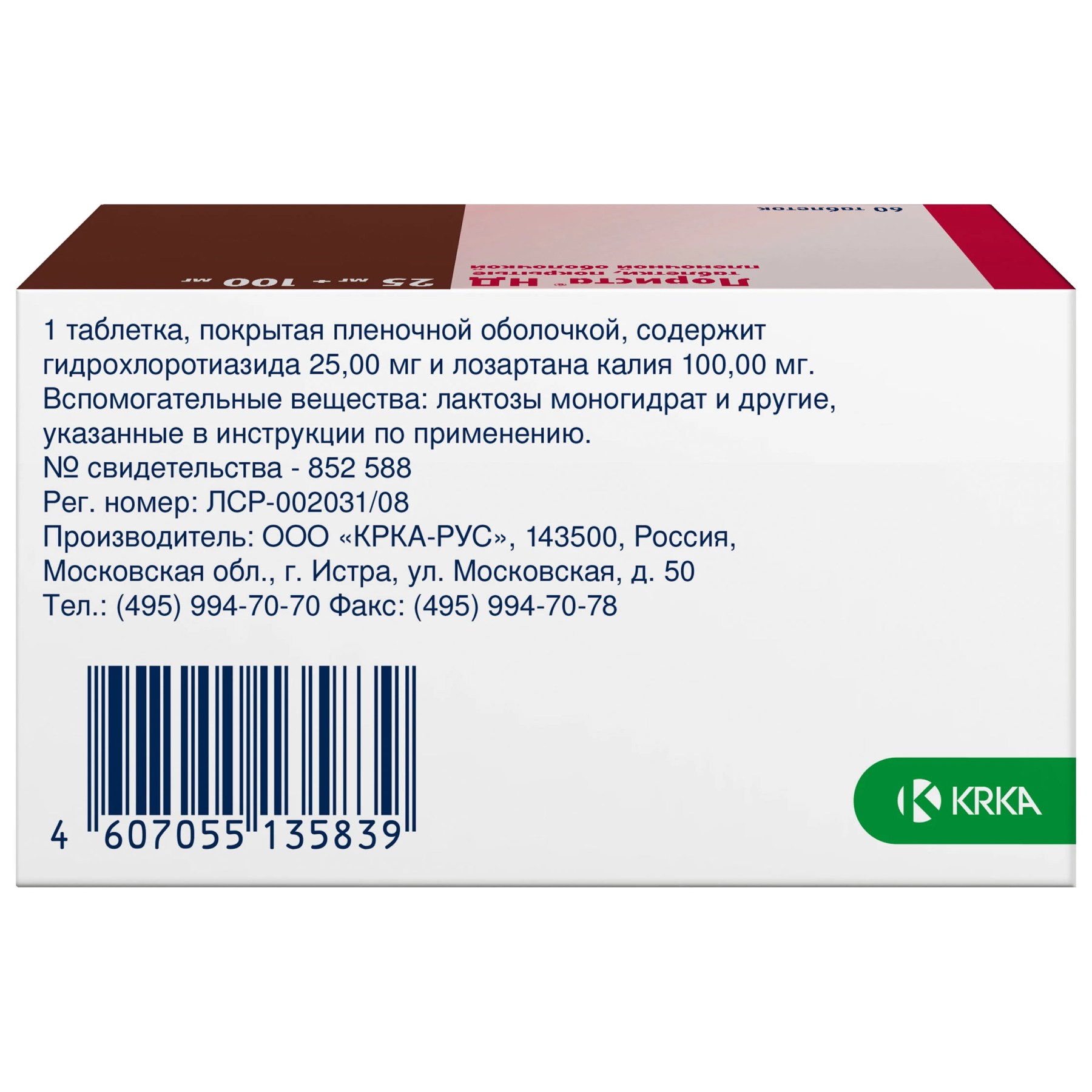 Действующие вещества: лозартан калия - 100 мг, гидрохлоротиазид - 25 мг.