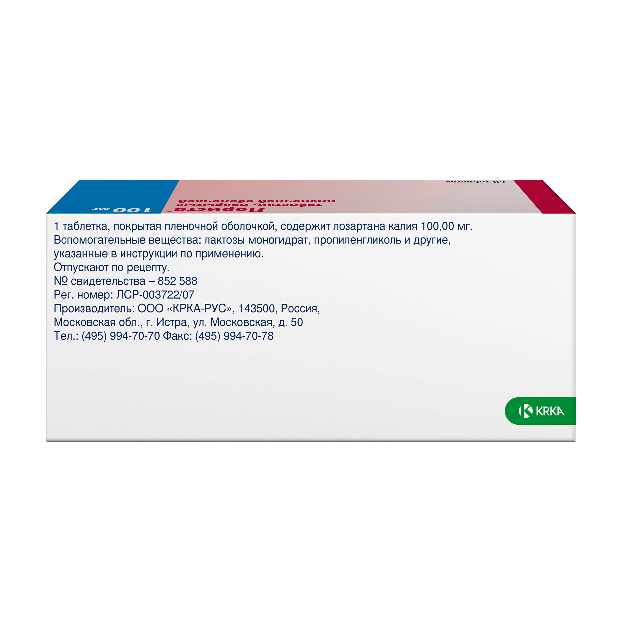 Активное вещество: лозартан калия 100 мг.