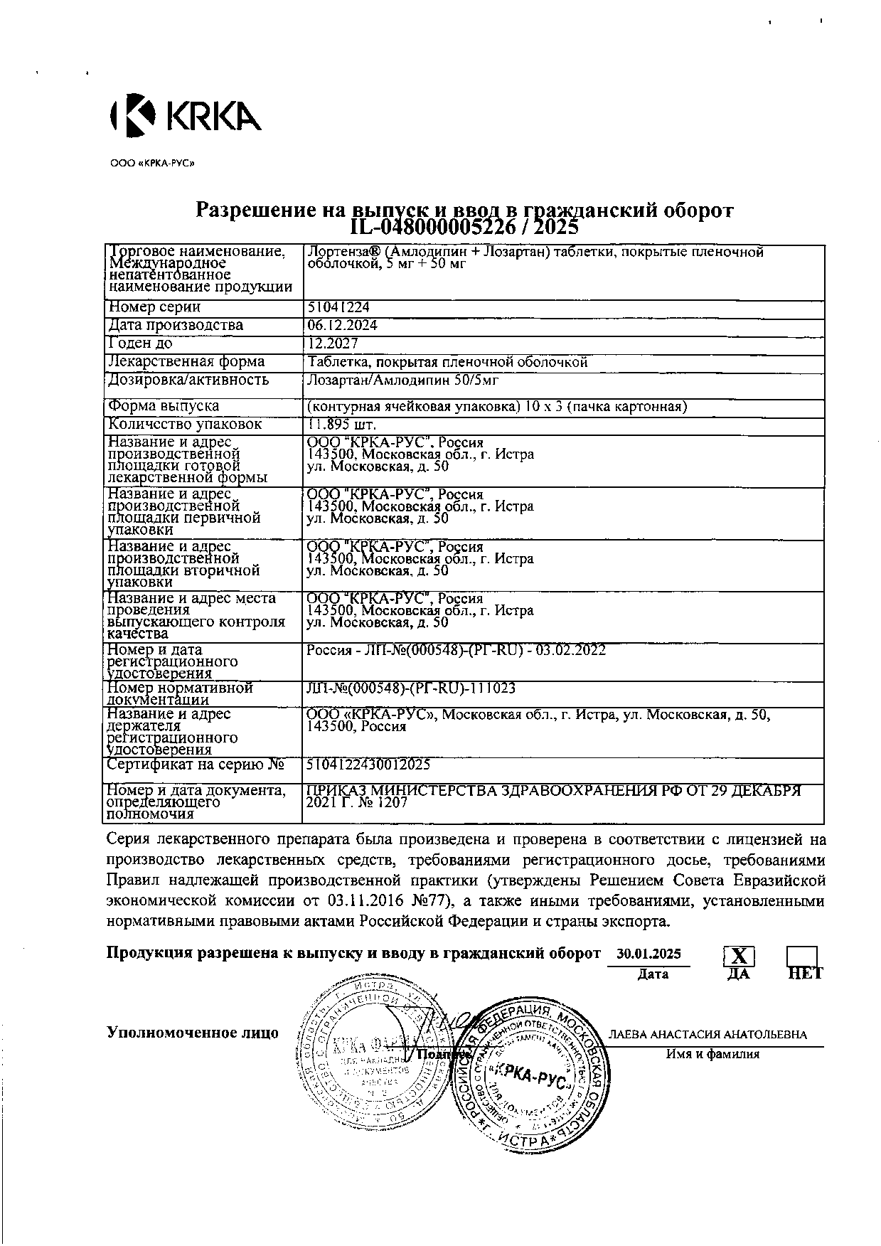 Действующие вещества: амлодипина безилат (амлодипина бесилат) 6,94 мг, эквивалентно амлодипину 5,00 мг, Лозартан А, субстанция-гранулы 163,55 мг, содержит лозартана калия 50,00 мг.
