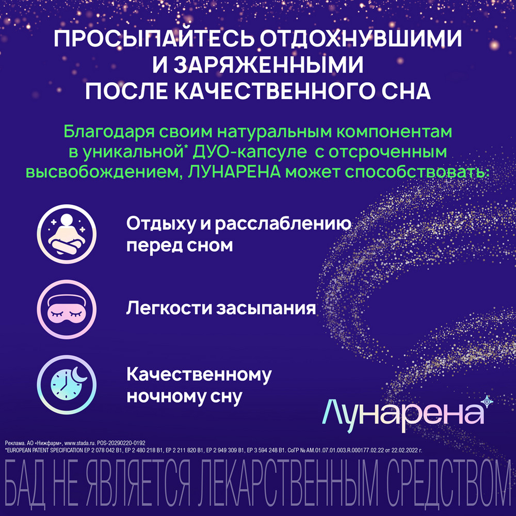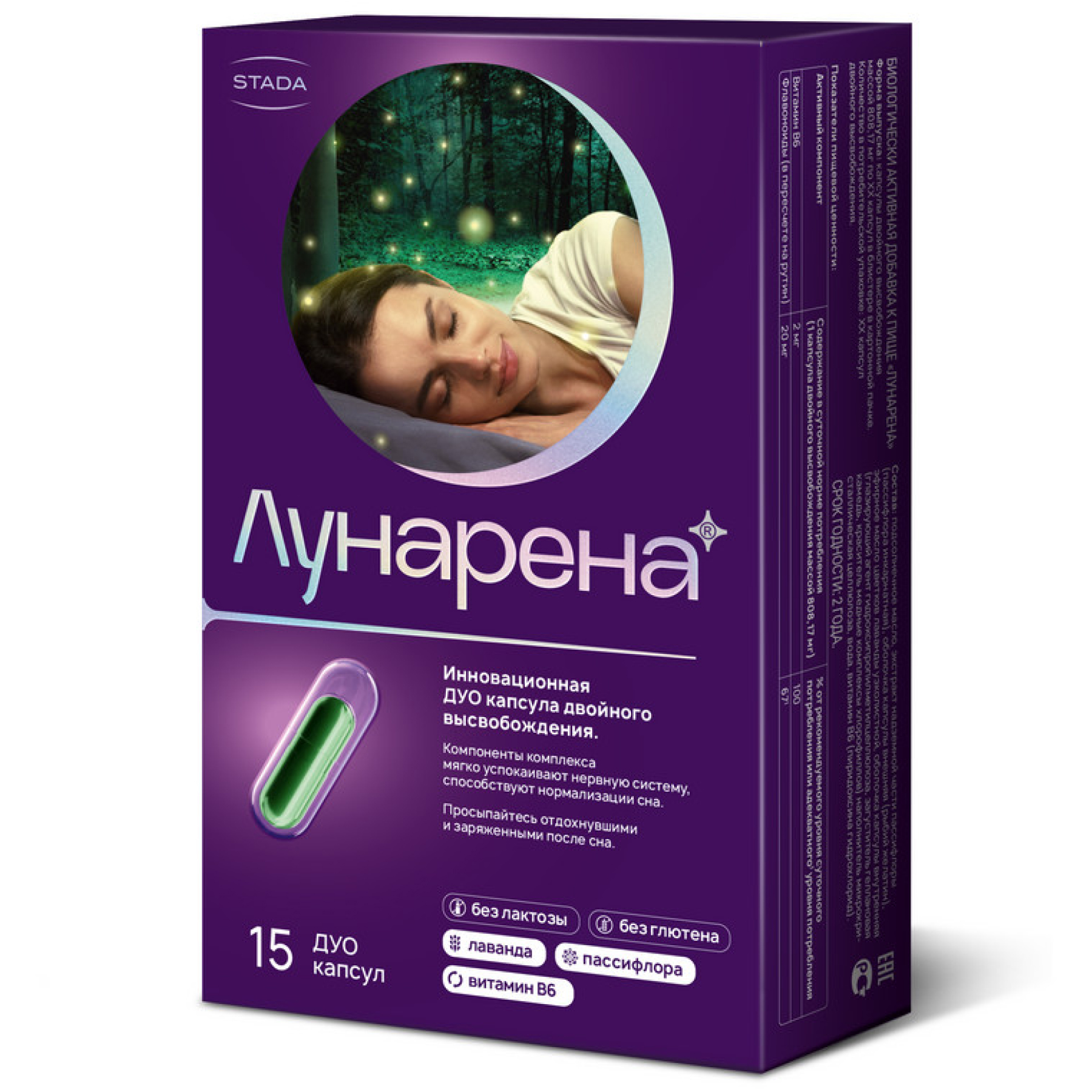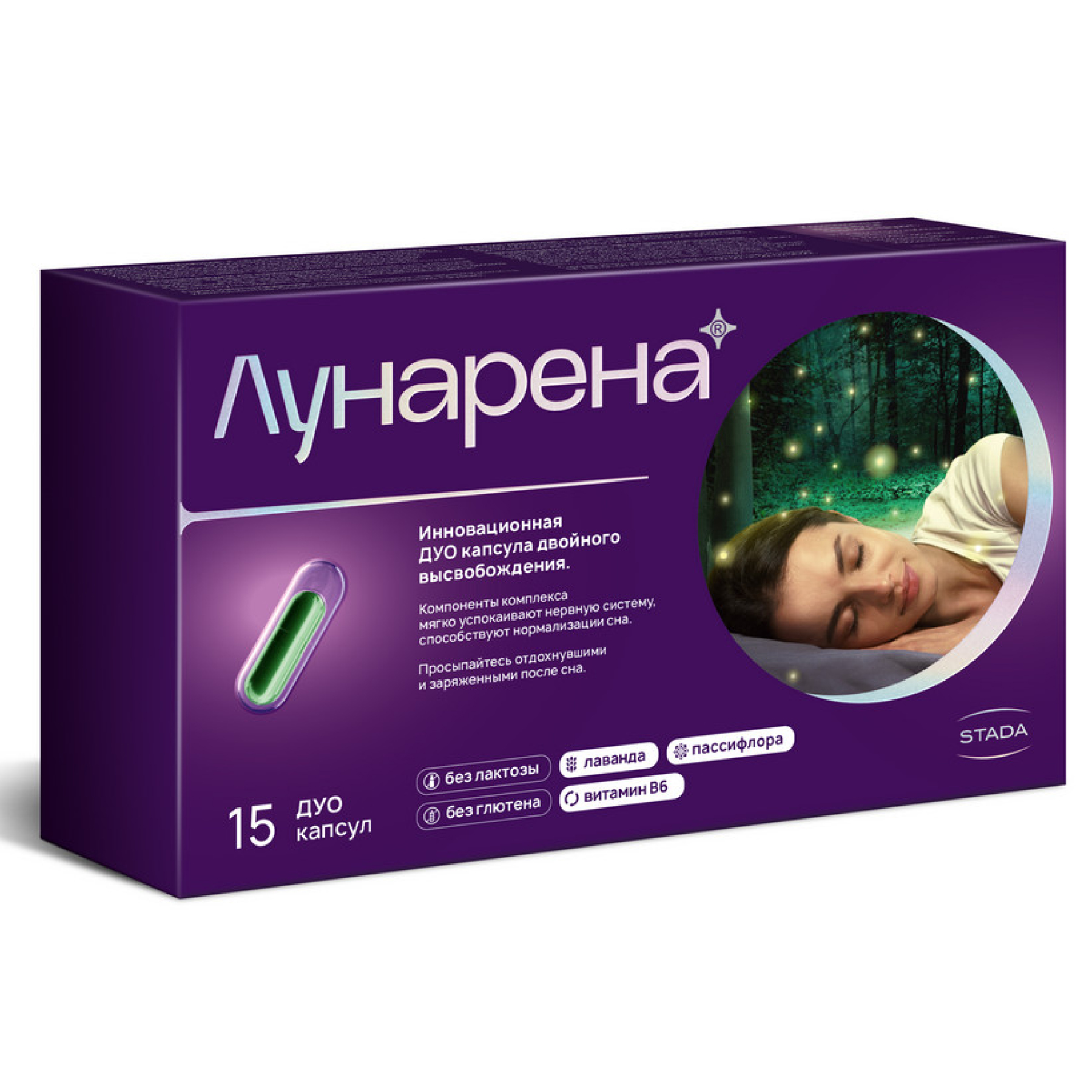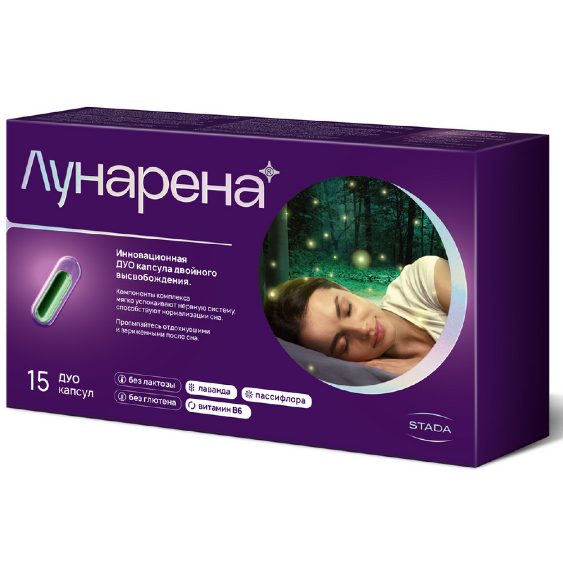 Лунарена - уникальная сбалансированной комбинация растительных компонентов и витамина B6, которые при совместном применении могут помочь сделать сон здоровым, крепким и полноценным, что позволит вам начать новый день отдохнувшими и полными сил! Экстракт пассифлоры инкарнатной и масло лаванды позитивно влияют на когнитивные функции и качество жизни. Стресс, чувство тревоги, беспокойства, страхи, навязчивые мысли, плохая гигиена сна, изменения в образе жизни или эмоционально-насыщенные события часто приводят к проблемам со сном. Качество и продолжительность сна могут оказывать существенное влияние на здоровье, ведь от качества сна зависит иммунитет, здоровье сердечно-сосудистой и эндокринной системы, когнитивные функции. Трудности засыпания, частые ночные пробуждения, поверхностный сон могут привести к усталости, нарушениям внимания и запоминания информации, расстройствам настроения, раздражительности, дневной сонливости, снижении мотивации и инициативности, склонности к ошибкам за рулем и на работе, мышечным напряжениям и головной боли. Благодаря своим компонентам в уникальной ДУО-капсуле (капсула в капсуле, DRcaps®) с отсроченным высвобождением, ЛУНАРЕНА может способствовать: Отдыху и расслаблению перед сном Легкости засыпания Качественному ночному сну С этого момента просыпайтесь отдохнувшими и заряженными после качественного сна. УНИКАЛЬНАЯ ТЕХНОЛОГИЯ: инновационная капсула двойного высвобождения может действовать на двух уровнях: мягко успокаивать нервную систему и способствовать нормализации сна. Эфирное масло лаванды (Lavandula Angustifolia Mill, 80 мг): помогает снижать уровень тревожности и стресса, смягчает возбудимость и раздражительность, помогает организму справляться с физическими и эмоциональными перегрузками, способствует снижению напряжения и усталости после трудного рабочего дня, уменьшению тревожности. Экстракт пассифлоры инкарнатной (Passiflora incarnata, 200 мг): оказывая мягкое успокаивающее действие на нервную систему и воздействуя на цикл сон-бодрствование (показано в экспериментальных исследованиях), может позитивно влиять на качество и продолжительность сна, что поможет вам спать крепче и проснуться отдохнувшими и полными сил. Витамин B6: поддерживает нормальное функционирование нервной системы, а также участвует в иммунных реакциях организма. Кроме того, имеются данные, что прием витамин B6 перед сном может сделать сновидения более запоминающимися. Инновационная капсула двойного высвобождения ЛУНАРЕНА — это не только уникальная комбинация компонентов, но и способ выпуска — капсула в капсуле — который был исследован и оптимизирован. Наружная капсула растворяется после проглатывания и высвобождает эфирное масло лаванды, которое может способствовать более спокойному засыпанию и оптимально подготовить вас к спокойному ночному сну. Внутренняя капсула благодаря технологии отсроченного высвобождения постепенно высвобождает экстракт пассифлоры инкарнатной и витамин B6 после приема внутрь, что позволяет им усваиваться, когда вы уже заснули. Компоненты, входящие в состав ЛУНАРЕНА: масло лавандовое, экстракт пассифлоры, витамин B6 могут способствовать уменьшению чувства тревоги, стресса, улучшению продолжительности и качества сна. Наружная капсула состоит из рыбьего желатина. Внутренняя капсула о