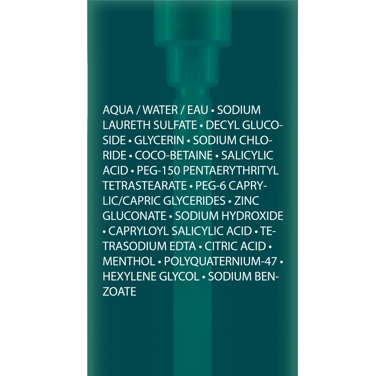 aqua/water, sodium laureth sulfate, decyl glucoside, glycerin, sodium chloride, coco-betaine, salicylic acid, peg-150 pentaerythrityl tetrastearate, peg-6 caprylic/capric glycerides, zinc gluconate, sodium hydroxide, capryloyl salicylic acid, tetrasodium edta, citric acid, menthol, polyquaternium-47, hexylene glycol, sodium benzoate. (code f.i.l.: b243870/1).
