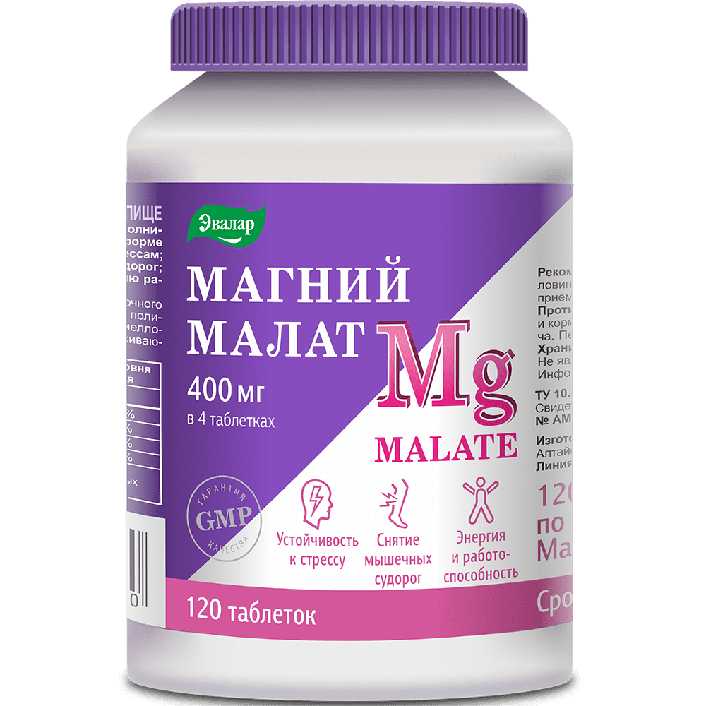 Магний малат – это соединение магния с яблочной кислотой. Яблочная кислота участвует в цикле Кребса, который отвечает за производство энергии в клетках, что повышает физическую выносливость и работоспособность. Именно поэтому в отличие от других форм магния малат рекомендуется принимать утром или в первой половине дня, т.к. он может «бодрить». Малат магния можно применять при болях и судорогах в мышцах, быстрой утомляемости, хронической усталости (т.к. он повышает выработку энергии) и в целом для поддержки нервной системы.