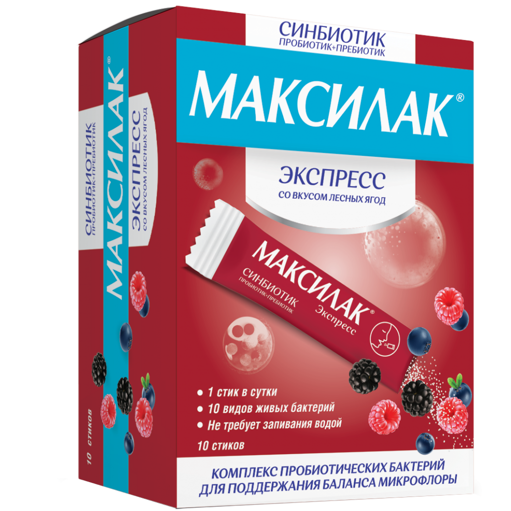 Это синбиотический комплекс в форме порошка со вкусом лесных ягод, который растворяется на языке и не требует запивания водой. В состав Синбиотика Максилак® Экспресс входят живые лакто-, бифидобактерии и молочнокислые микроорганизмы, а также пребиотик – фруктоолигосахариды, способствующие более быстрой адаптации и стимулирующие рост и/или повышение биологической активности нормальной микрофлоры кишечника. Кишечная микрофлора выполняет множество различных функций: участвует в пищеварении, обменных процессах, обезвреживании болезнетворных бактерий и поддержании иммунитета, синтезе ряда витаминов и других полезных веществ, необходимых для поддержания здоровья желудочно-кишечного тракта и всего организма. В норме полезные бактерии составляют более 98 % микрофлоры9 и за счет своей жизнедеятельности сдерживают рост условно-патогенных микроорганизмов. Однако в определенных ситуациях часть полезных бактерий погибает, причиной гибели полезных микроорганизмов могут быть инфекционные заболевания, болезни желудочно-кишечного тракта (ЖКТ), неправильное питание, стресс, связанный, например, с изменением географических условий, характера питания, прием ряда лекарственных препаратов (в первую очередь антибиотиков). Это нарушает равновесие и может привести к появлению ряда неприятных проявлений, таких как диарея, запор, чередование запора и диареи, метеоризм, вздутие живота и др. Кроме этого, нарушение равновесия кишечной микрофлоры является одним из факторов, ведущих к развитию повышенной чувствительности к различным пищевым продуктам или аллергенам. Синбиотик Максилак® Экспресс обладает приятным ягодным вкусом, а входящие в его состав пробиотики поддержат баланс Вашей микрофлоры! Пробиотики в составе Синбиотика Максилак® Экспресс способствуют подавлению роста различных видов болезнетворных бактерий, восстанавливая равновесие кишечной микрофлоры, и за счет этого помогают нормализовывать обменные процессы, поддерживать иммунитет и способствуют повышению сопротивляемости организма простудным и инфекционным заболеваниям10. Эффективность пробиотиков, включающих несколько различных штаммов лакто- и бифидобактерий, достигается за счет синергизма входящих в их состав компонентов. Молочная кислота, синтезируемая лактобактериями, препятствует росту патогенной флоры, а также способствует усвоению витамина Д, железа, кальция. Фруктоолигосахариды (пребиотик в составе Синбиотика Максилак® Экспресс) снабжают пробиотические бактерии энергией и питательными веществами, стимулируя в 1,5–2 раза более быстрое их развитие.