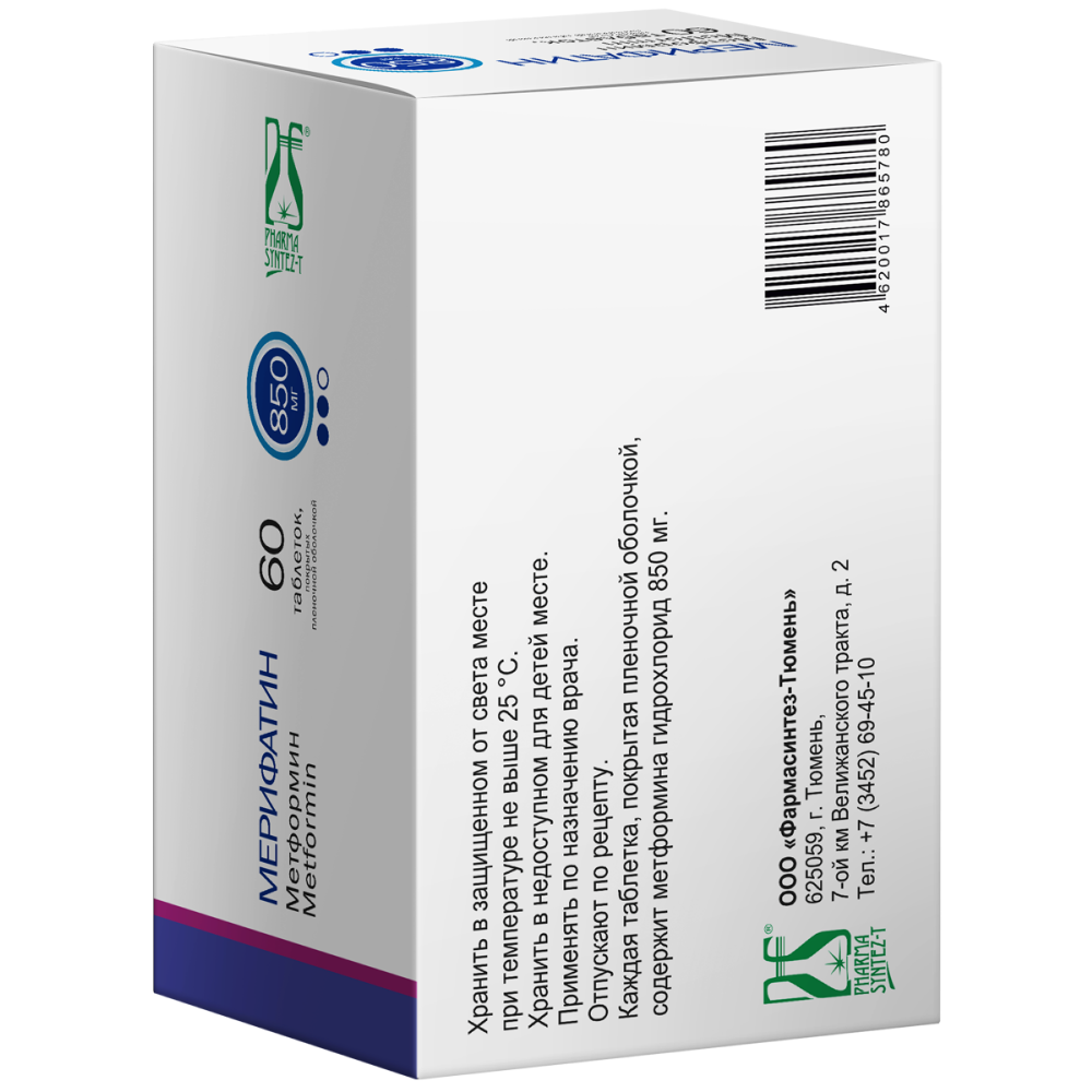 Действующее вещество: метформина гидрохлорид 850 мг.
