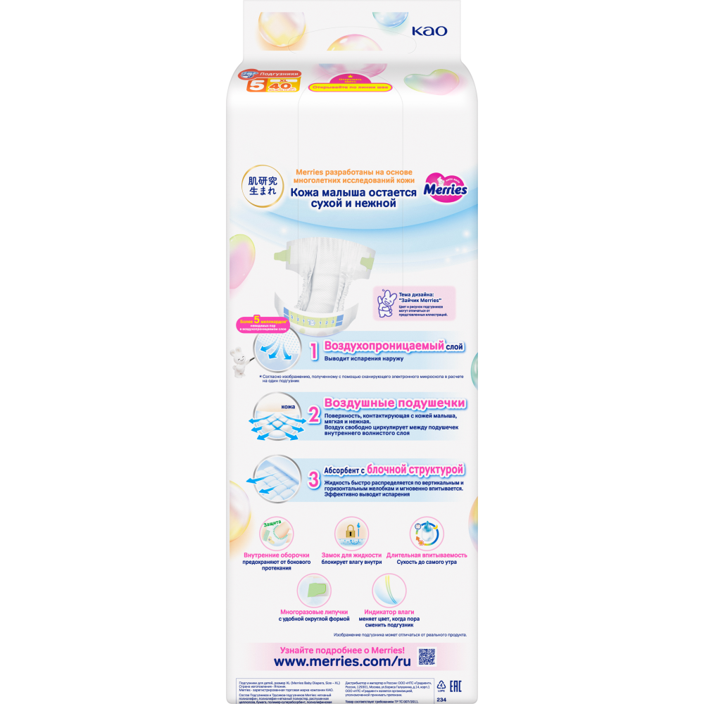 Детские одноразовые японские подгузники Merries (Меррис) для малышей с весом от 12 до 20 кг (размер XL, 5) созданы с особенной заботой о коже и комфорте Вашего ребёнка.