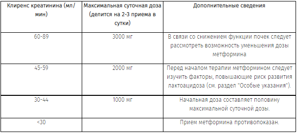 Функция почек (КК) должна оцениваться до начала терапии метформином, а затем не реже 1 раза в год. У пациентов с повышенным риском прогрессирования почечной недостаточности и у пожилых людей функцию почек следует контролировать чаще (каждые 3-6 месяцев).