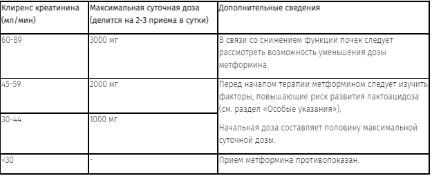 Из-за возможного снижения функции почек дозу метформина необходимо подбирать под регулярным контролем показателей функции почек (определять концентрацию креатинина в сыворотке крови не менее 2-4 раз в год).