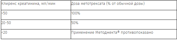 Методжект® должен применяться с осторожностью. Дозу в зависимости от значения клиренса креатинина следует скорректировать в соответствии со следующей таблицей:
