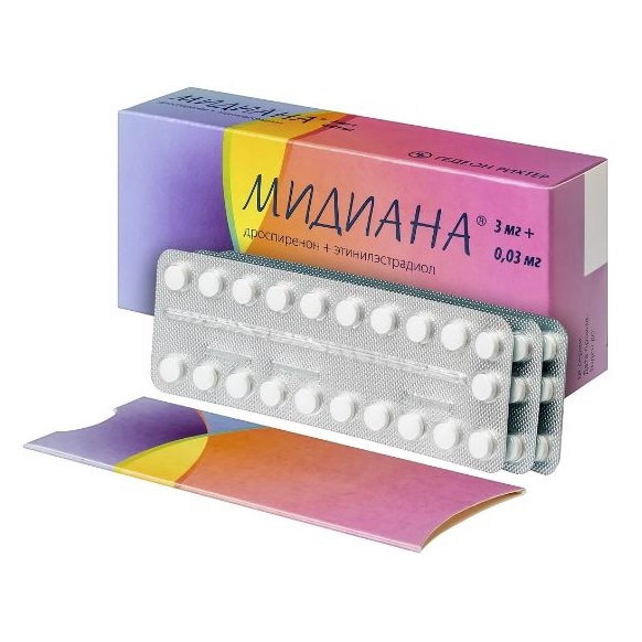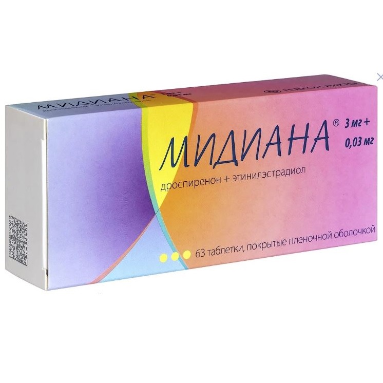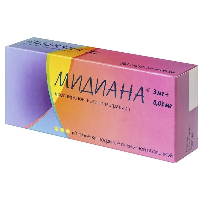 Дроспиренон, входящий в состав препарата Мидиана®, обладает антиминералокортикоидной активностью и способен предупреждать увеличение массы тела и появление других симптомов (например, отеков), связанных с эстрогензависимой задержкой жидкости. Дроспиренон оказывает положительное воздействие на предменструальный синдром. В сочетании с этинилэстрадиолом дроспиренон демонстрирует благоприятный эффект на липидный профиль, характеризующийся