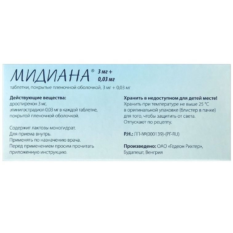 Прием препарата Мидиана® начинается в первый день менструального цикла (то есть в первый день менструального кровотечения). Допускается начало приема на 2-5 день менструального цикла, но в этом случае рекомендуется дополнительно использовать барьерный метод контрацепции (например, презерватив) в течение первых 7 дней приема таблеток из первой упаковки.