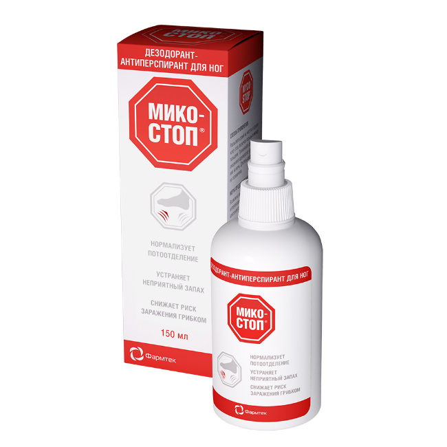 Лечебно-профилактический, освежающий и расслабляющий дезодорант-антиперспирант для ног МИКОСТОП улучшает циркуляцию крови и лимфы и помогает избавиться от неприятного запаха. Спрей легко наносить на кожу, что позволяет ухаживать за кожей ног вне дома. Это действенное косметическое средство можно использовать несколько раз в день. МИКОСТОП дезодорант-антиперсперант для ног (спрей) для устранения неприятного запаха и нормализации потоотделения. Имеет двойной механизм действия - нормализует потоотделение и подавляет размножение бактерий и грибов. Ежедневное использование также снижает риск заражения грибами, вызывающими микозы стоп.