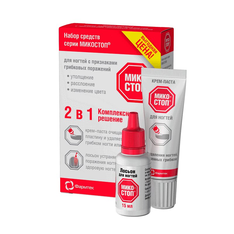 Механизм действия крем-пасты МИКОСТОП основан на способности мочевины (карбамида) в концентрации 40% притягивать и удерживать влагу и тем самым разрыхлять и размягчать ткань ногтя до такого состояния, когда она легко удаляется скребком или пилкой для ногтей. Специально разработанная рецептура МИКОСТОП крема-пасты и методика применения обеспечивают условия, когда средство длительно удерживается на поверхности ногтевой пластины и проникает в ее толщу достаточно глубоко, чтобы в полной мере реализовать эффект мочевины. Удаление пораженной ногтевой пластины происходит постепенно и безболезненно. Необходимое количество применений зависит от толщины ногтевых пластин и обширности их поражений. Применяется на ногтях пальцев ног и рук.