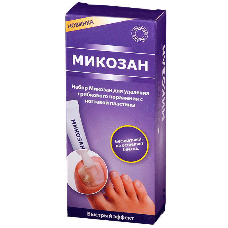 При нанесении на ноготь Микозан образует водорастворимую пленку, покрывающую его поверхность и глубоко проникая в толщу, повышая плотность структур ногтевых пластинок, снижая их пористость, а также формируя защиту от воздействия патогенных грибов, создавая условия, неблагоприятные для их роста. Микозан оказывает разрушительное воздействие на липидную оболочку грибов, вызывая их гибель. Действие Микозана предотвращает дальнейший рост и распространение грибов по ногтю, способствуя его естественному отрастанию.