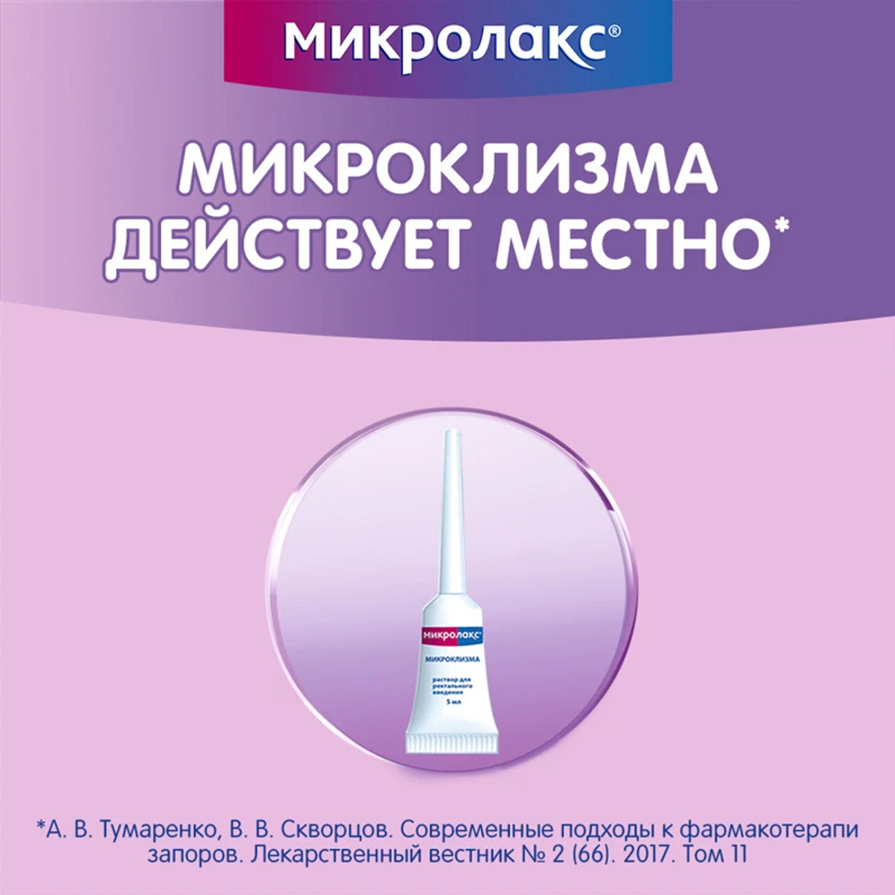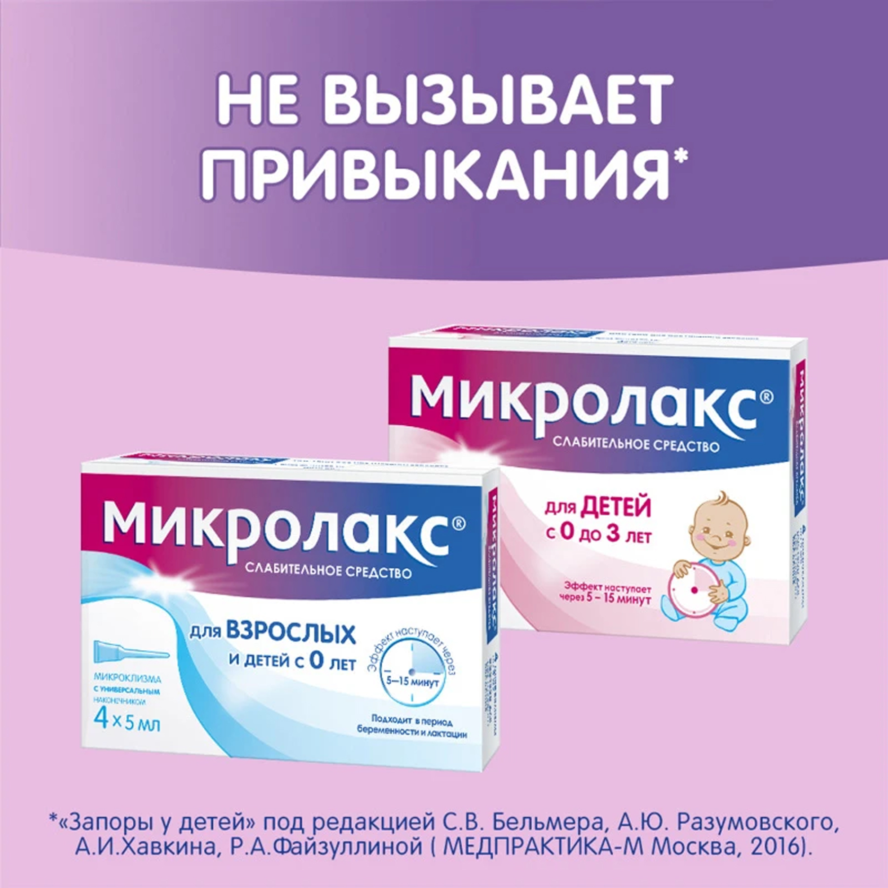 Микролакс® раствор для ректального введения (микроклизмы) 5мл №4 Микролакс® - комбинированный препарат, оказывающий слабительное действие. Может помочь бороться с задержкой стула, а также подходит для подготовки к эндоскопическому (ректороманоскопия) и рентгенологическому исследованию желудочно-кишечного тракта. Микролакс® - мягкое слабительное средство в уникальном формате микроклизмы (1), может начать бороться с запором уже через 5-15 минут. Микролакс® - средство при запоре №1 на рынке России по продажам в денежном выражении (2). ОСНОВНЫЕ ПРЕИМУЩЕСТВА Линейка Микролакс® включает в себя: раствор для ректального введения (микроклизмы) №4, №12 и раствор для ректального введения (микроклизмы) для детей №4 со специальным укороченным носиком. Возможность рассчитать время действия: Микроклизма Mикролакс® может начать бороться с запором уже через 5-15 минут. Слабительный препарат способствует мягкому освобождению от запора и предотвращает интоксикацию. Универсальное слабительное при запорах для всей семьи: Мягкое слабительное средство, универсальный препарат подходит беременным и кормящим женщинам, а также детям с рождения(5). Простота в использовании: Уникальное средство от запора в формате микроклизмы (1). Удобный формат микроклизмы позволяет взрослым применять препарат самостоятельно, а специальный носик с возможностью регулировать глубину введения делает безопасным использование даже для новорожденных. Легкое и комфортное применение для всей семьи. Регулярность и длительность применения: Микролакс® – мягкое слабительное для регулярного применения (3). При длительном применении Микролакс® не вызывает привыкания (4). Может применяться в комплексе с другими препаратами: Слабительное Микролакс® практически не вступает в межлекарственные взаимодействия. Лекарство при запоре действует местно и не всасывается через стенки кишечника, благодаря чему помогает деликатно решать проблему запора. По 5 мл раствора для ректального введения в микроклизме для однократного применения (полиэтиленовый тюбик с укороченным или универсальным наконечником и отламывающейся пломбой). ДРУГОЕ В состав препарата входят: 1) натрия цитрат - вытесняет связанную воду, содержащуюся в каловых массах; 2) натрия лаурилсульфоацетат - разжижает содержимое кишечника; 3) сорбит - усиливает слабительное действие путем стимуляции поступления воды в кишечник. Увеличение количества воды за счет пептизации и разжижения способствует размягчению каловых масс и облегчает опорожнение кишечника. Способ применения: Микролакс® от запора прост в применении: 1. Отломите пломбу на наконечнике тюбика. 2. Слегка надавите на тюбик, так, чтобы капля Микролакс® смазала кончик микроклизмы. 3. Введите наконечник микроклизмы на всю длину и сдавите тюбик, полностью выдавив все его содержимое. 4. Продолжая сдавливать тюбик, осторожно извлеките наконечник. ССЫЛКИ 1. https://grls.rosminzdrav.ru/default.aspx. 2. По данным IQVIA (с англ. АЙКЬЮВИА) по продажам в деньгах, MAT Декабрь 2019. 3. При каждом эпизоде каловой пробки. Если жалобы сохраняются длительно, необходимо обратиться к специалисту 4. «Запоры у детей» под редакцией С.В. Бельмера, А.Ю. Разумовского, А.И.Хавкина, Р.А.Файзуллиной ( МЕДПРАКТИКА-М Москва, 2016). 5. Согласно инструкции по применению.
