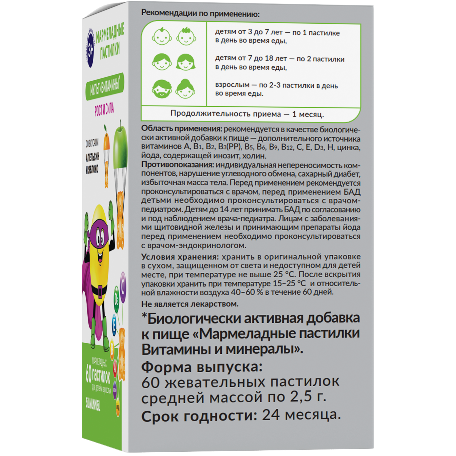 «Мармеладные пастилки Витамины и минералы» — комплекс, охватывающий большую группу органических соединений и минеральных веществ, которые способствуют интеллектуальному развитию детей, укреплению памяти, повышению концентрации внимания, активизации познавательных функций, поддержанию нормальной работы головного мозга.