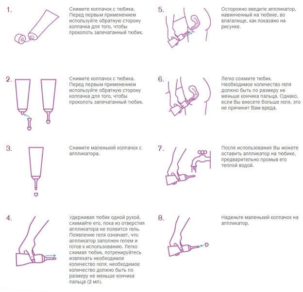 Вы можете использовать специальный аппликатор. Он прилагается в комплекте и навинчивается на тюбик. С помощью аппликатора Вы можете ввести гель во влагалище. После использования Вы можете оставить аппликатор на тюбике, промыв его теплой водой и затем надеть на него колпачок. Средство можно вводить внутрь не аппликатором, а пальцем. Для этого вымойте руки и нанесите гель на указательный палец в количестве, которое должно быть по размеру не меньше кончика указательного пальца. Введите палец во влагалище.
