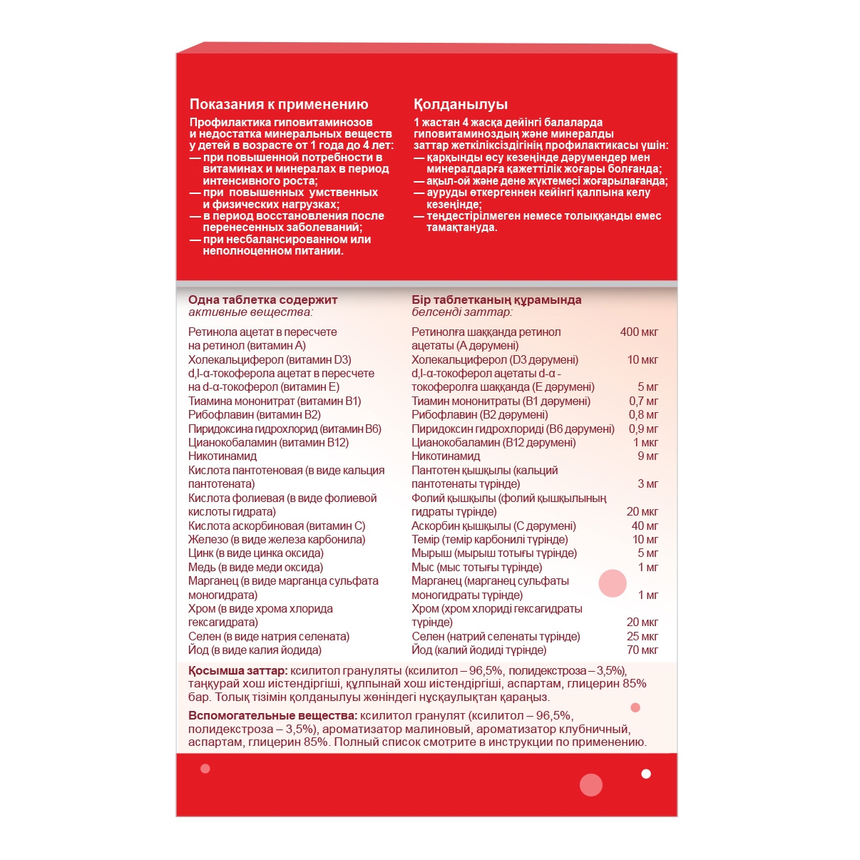 Фруктоза, кальция карбонат, носитель целлюлоза микрокристаллическая, L-аскорбиновая кислота, стабилизатор стеариновая кислота, железа фумарат, агент антислеживающий диоксид кремния аморфный, гидроортофосфат кальция, DL-альфа-токоферола ацетат, цинка оксид, никотинамид, регулятор кислотности лимонная кислота, ароматизаторы натуральные (малиновый, клубничный), носитель гидроксипропилметилцеллюлоза, носитель эфир крахмала и натриевой соли октенилянтарной кислоты, тиамина мононитрат, бета-каротин, рибофлавин, пиридоксина гидрохлорид, носитель моно- и диглицериды жирных кислот, желатин, агент влагоудерживающий глицерин, фолиевая кислота, антиокислитель аскорбиновая кислота, калия йодид, хрома (III) хлорид, натрия селенат, фитоменадион, носитель гуммиарабик, D-биотин, антиокислитель аскорбат натрия, холекальциферол, антиокислитель альфа-токоферол, цианокобаламин, сахароза, триглицериды среднецепочечных жирных кислот, регулятор кислотности цитрат натрия 3-замещенный.