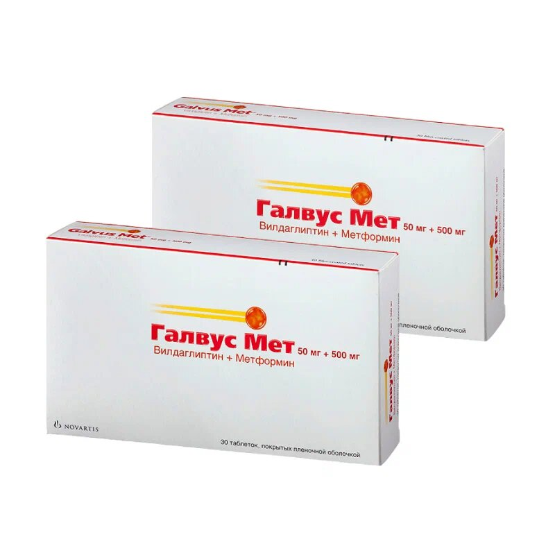 Механизм действия препарата Галвус Мет® заключается в увеличении выработки инсулина и уменьшении выработки глюкагона (эффект вилдаглиптина) в поджелудочной железе, а также повышении эффективности использования инсулина, вырабатываемого в организме (эффект метформина). Препарат Галвус Мет® помогает контролировать уровень сахара в крови.