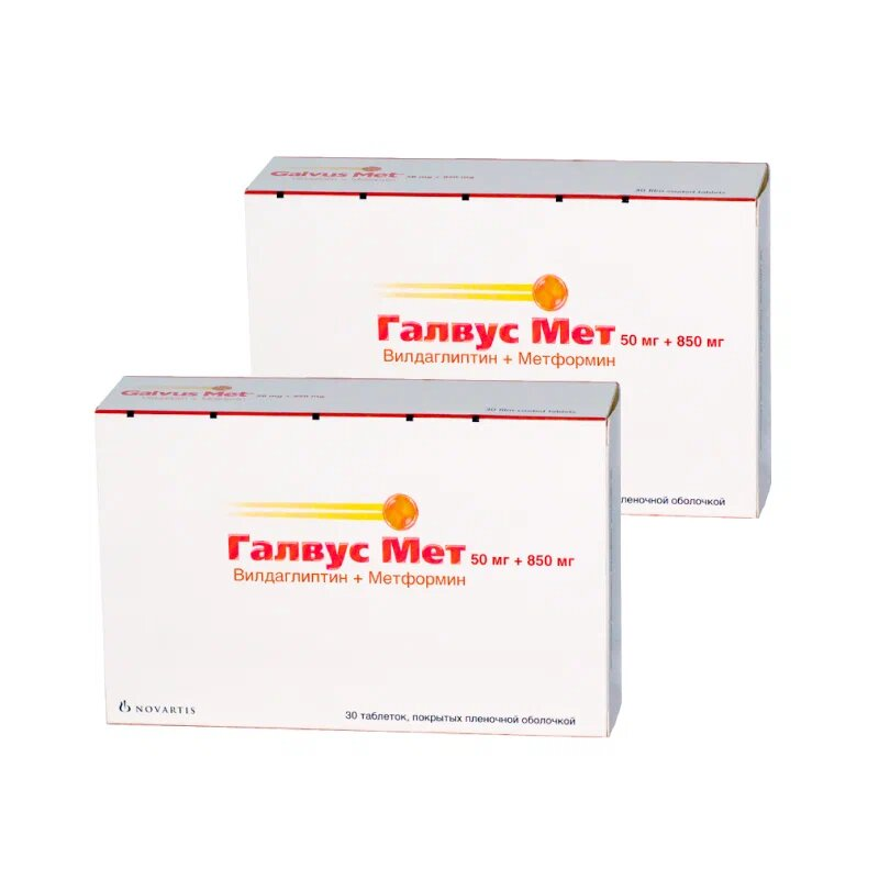 Механизм действия препарата Галвус Мет® заключается в увеличении выработки инсулина и уменьшении выработки глюкагона (эффект вилдаглиптина) в поджелудочной железе, а также повышении эффективности использования инсулина, вырабатываемого в организме (эффект метформина). Препарат Галвус Мет® помогает контролировать уровень сахара в крови.