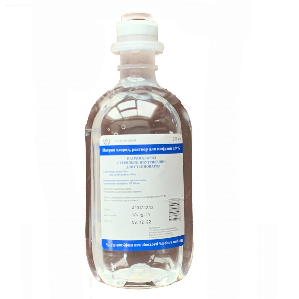Симптомы: тошнота, рвота, спастические боли в животе, жажда, пониженное слюно- и слезоотделение, повышенное потоотделение, лихорадка, тахикардия, повышение артериального давления, почечная недостаточность, периферические отеки, отек легких, остановка дыхания, головная боль, головокружение, беспокойство, раздражительность, слабость, мышечные судороги и ригидность, генерализованные судороги, кома и смерть. Избыточное введение раствора натрия хлорида 0,9% может вызывать гипернатриемию. Избыточное поступление хлорида в организм может приводить к гиперхлоремическому ацидозу. Если раствор натрия хлорида 0,9% используется в качестве базового раствора для разведения и транспорта других препаратов, симптомы и жалобы при избыточном введении наиболее часто связаны со свойствами добавленных в раствор препаратов. В случае непреднамеренного избыточного введения раствора лечение следует прекратить и оценить состояние пациента.