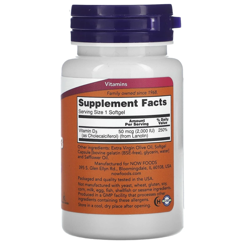 Капсулы с витамином D3 от компании NOW® обеспечивают этот важнейший витамин в легкоусвояемой форме. Обычно витамин D попадает в организм из еды либо вырабатывается кожей под воздействием солнечных ультрафиолетовых лучей. Однако в еде он содержится в недостаточном количестве. Поскольку многие люди стремятся избегать воздействия солнца, то необходимость в дополнительном приеме витамина D становится все более насущной.